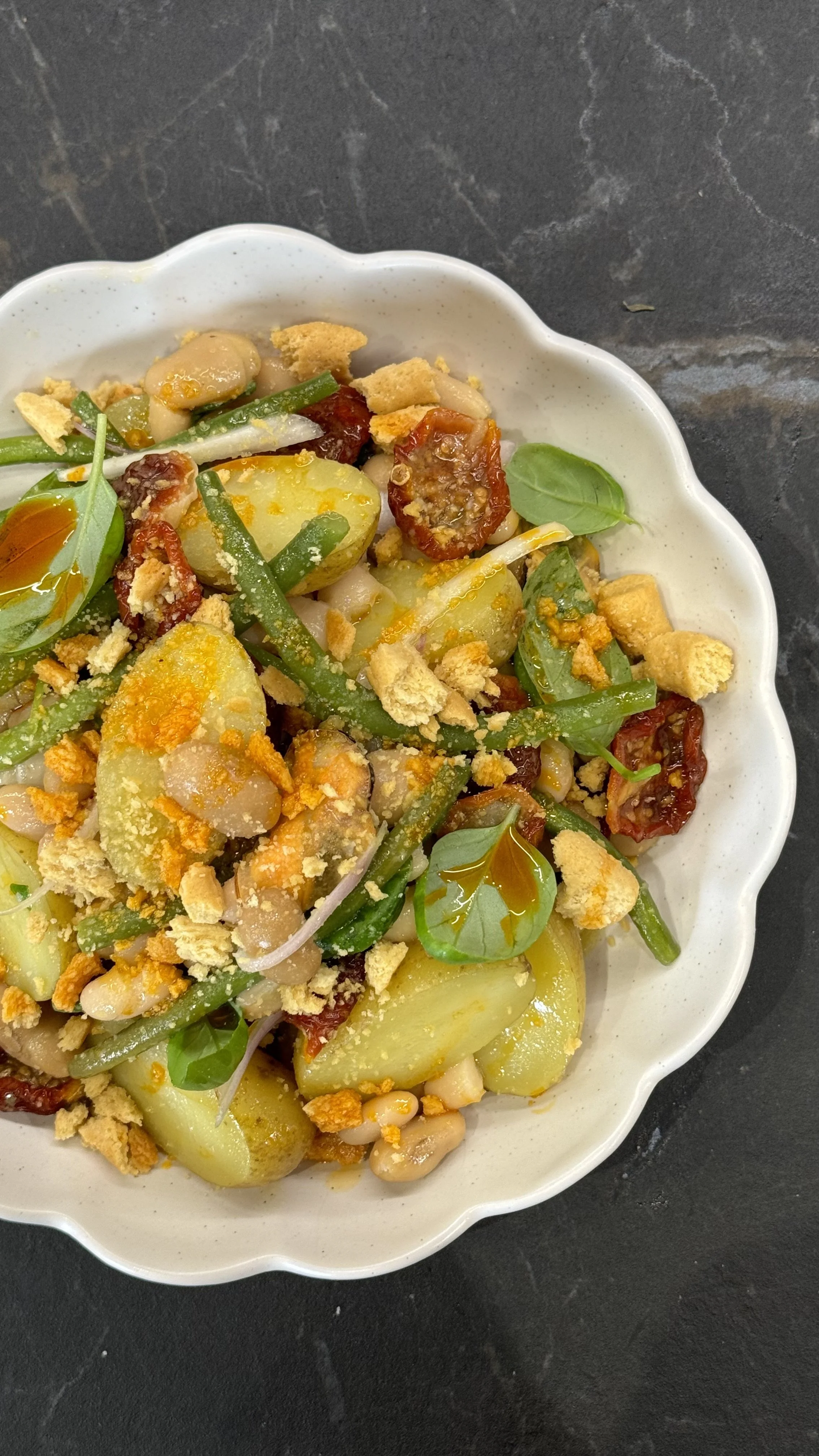 Tagliate a metà le patate Novelle e cuocetele a vapore per 7-8 minuti. Aggiungete poi anche i fagiolini, chiudete e lasciate cuocere ancora 5-6min. Ancora consistenti, posizionatele in ciotola. Unite della cipolla rossa di Tropea tagliata sottile, le due qualità di fagioli, i pomodori secchi. Infine tanto basilico e le cozze. Per la salsa emulsionate l’acqua delle cozze con olio e succo di limone. Acqua e succo di limone devono essere in pari quantità rispetto all’olio. Emulsionate fino a che diventa bella densa e condite l’insalata.