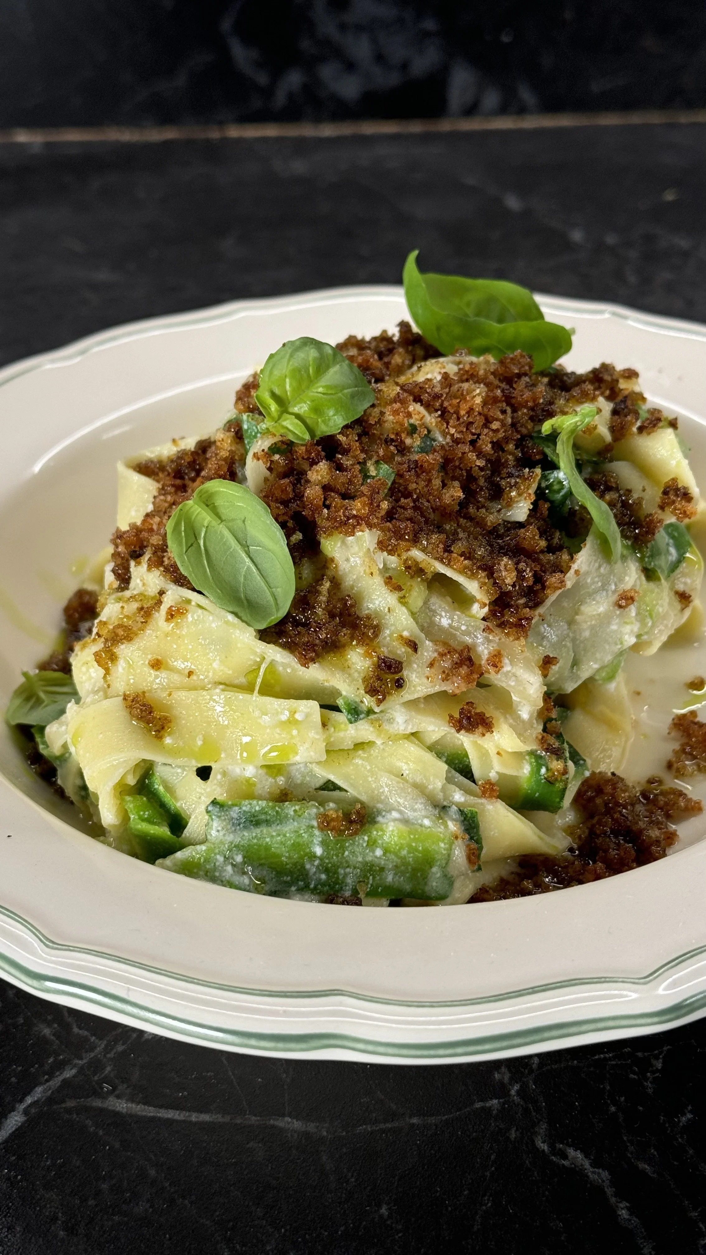Impiattate con tutte le fettuccine alla base del piatto, le briciole di pane croccanti, basilico e un po’ di olio evo a crudo.