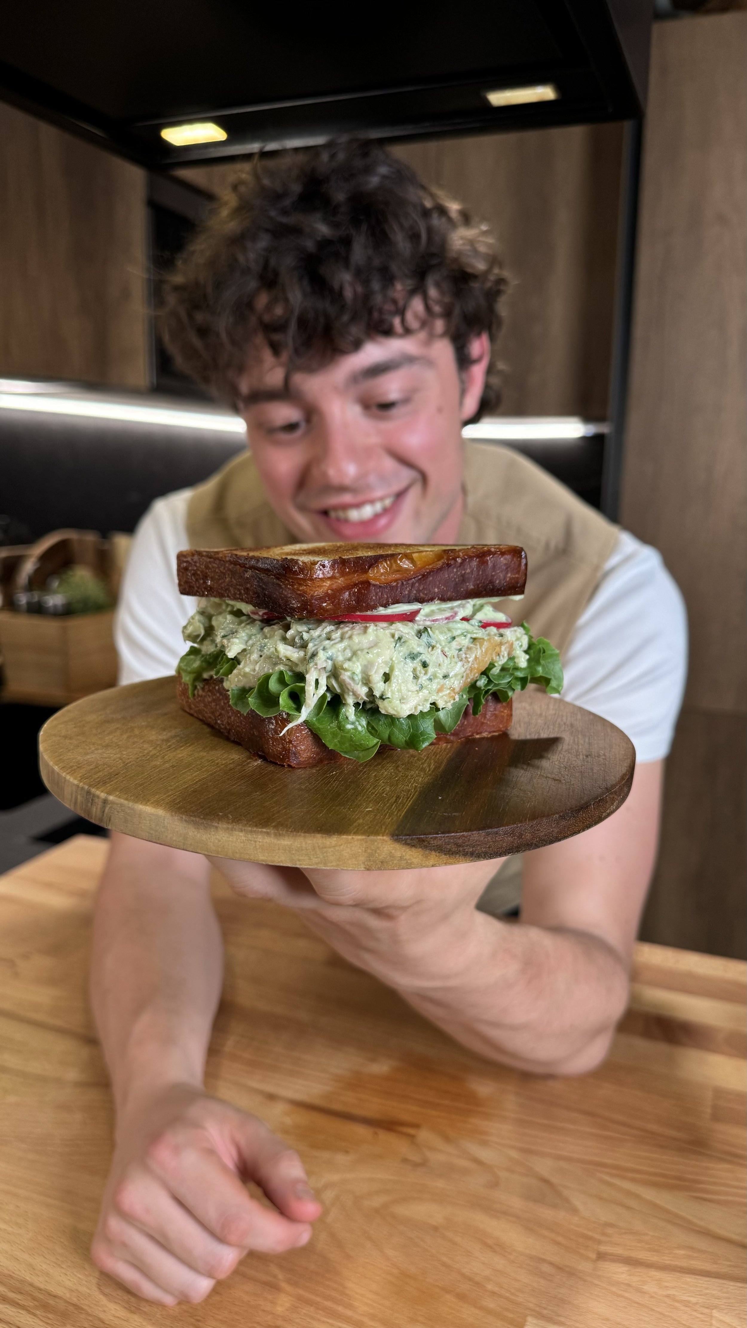 Mettete l’avocado, metà cipolla rossa tagliata sottile e anche i gambi, i gambi del prezzemolo, l’olio evo, il sale grosso, il succo di 1 limone e lo yogurt greco nel bicchiere di un frullatore. Il limone e il sale aiuteranno a mantenere il colore. Frullate un minuto, non di più, altrimenti la salsa tenderà a scurirsi. Condite il pollo sfilacciato e bilanciate per dare un po’ di freschezza con la scorza di limone, il sedano sottile e il prezzemolo tritato. Tostate del buon pane in cassetta con un filo d’olio e componete il panino. Un po’ di salsa sulle due fette di pane, una foglia di insalata gentile alla base, tutta l’insalata di pollo abbondante e qualche ravanello sottile sottile. La sua piccantezza si sposa benissimo.