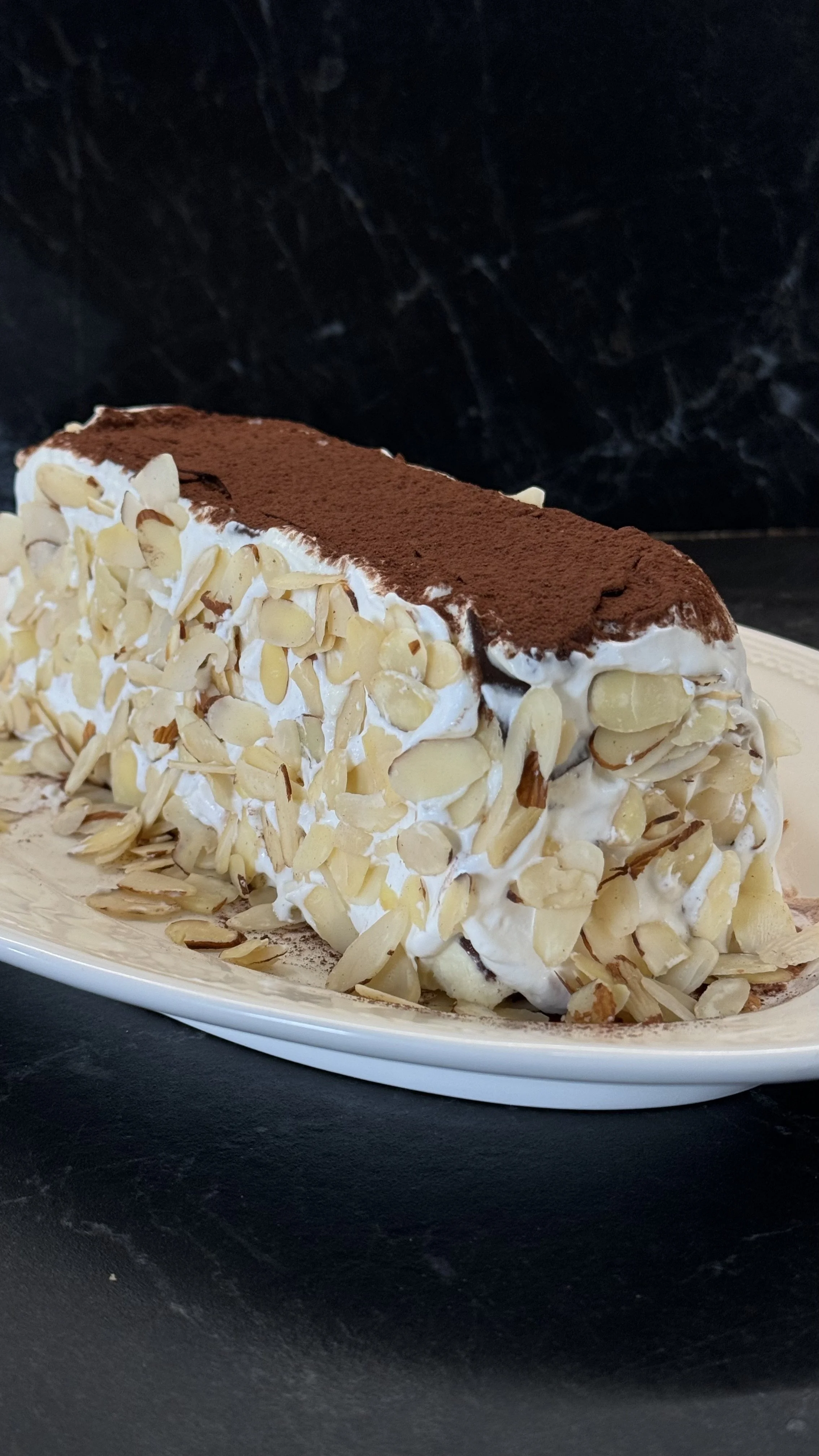 Componete in uno stampo da plumcake foderato con pellicola alternando gli strati di cioccolato, le mandorle a scaglie e la crema del semifreddo per almeno 4 volte. Ultimo strato con le mandorle. Coprite e lasciate raffreddare completamente in freezer, una notte meglio. Sformatelo e decorate con cacao amaro, panna montata e altre mandorle a piacimento.