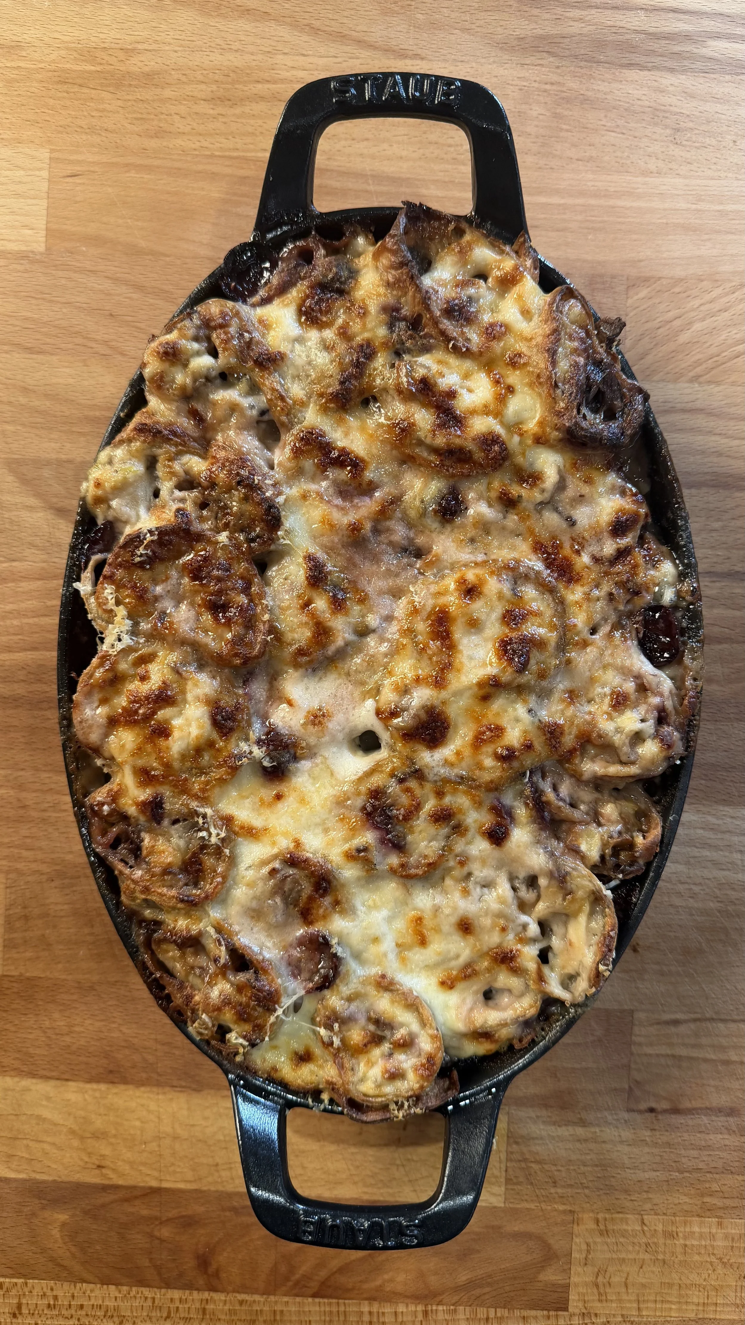 Partite dalla macerazione dell’uva moscato. Io l’ho pulita chicco chicco e poi messa a macerare nel vino per almeno 2 ore. Un’altra opzione dolce possono essere le pere, saltate leggermente in padella nel burro ed erbe aromatiche. Nel frattempo ho preparato il ragù di porri, tagliando questi ultimi sottili sottili e cotti nel burro insieme al sale, al pepe e del timo fresco. Ho aggiunto delle nocciole tritate grossolone e portato a cottura per 15-20 minuti. I radicchi tardivi li ho fatti saltare nel burro con del timo e sfumati leggermente con del vino rosso di macerazione, 5-6 minuti. Per le crespelle ho preso una parte di radicchi frullati con le uova, la farina e una parte di latte freddo. Ho aggiunto altro latte a filo per aggiustare la consistenza. Le ho cotte in una padella tonda calda e antiaderente con un filo di burro, un mestolo quasi colmo per volta, roteando l’impasto per renderlo di uno spessore uniforme. Una volta cotte potete iniziare a farcirle con una dose di besciamella alla base, il ragù di porri e nocciole, il radicchio, qualche acino d’uva e i formaggi: io ho scelto gorgonzola piccante e tomini piemontesi. Arrotolati e ben chiusi, tagliati in tre per creare le classiche rosette. In un teglia con alla base uno strato abbondante di besciamella disponete le rosette vicine vicine. Versate della panna all’interno che le renderà belle cremose e aggiungete besciamella e parmigiano sopra. In forno a 180° per 30’ circa.