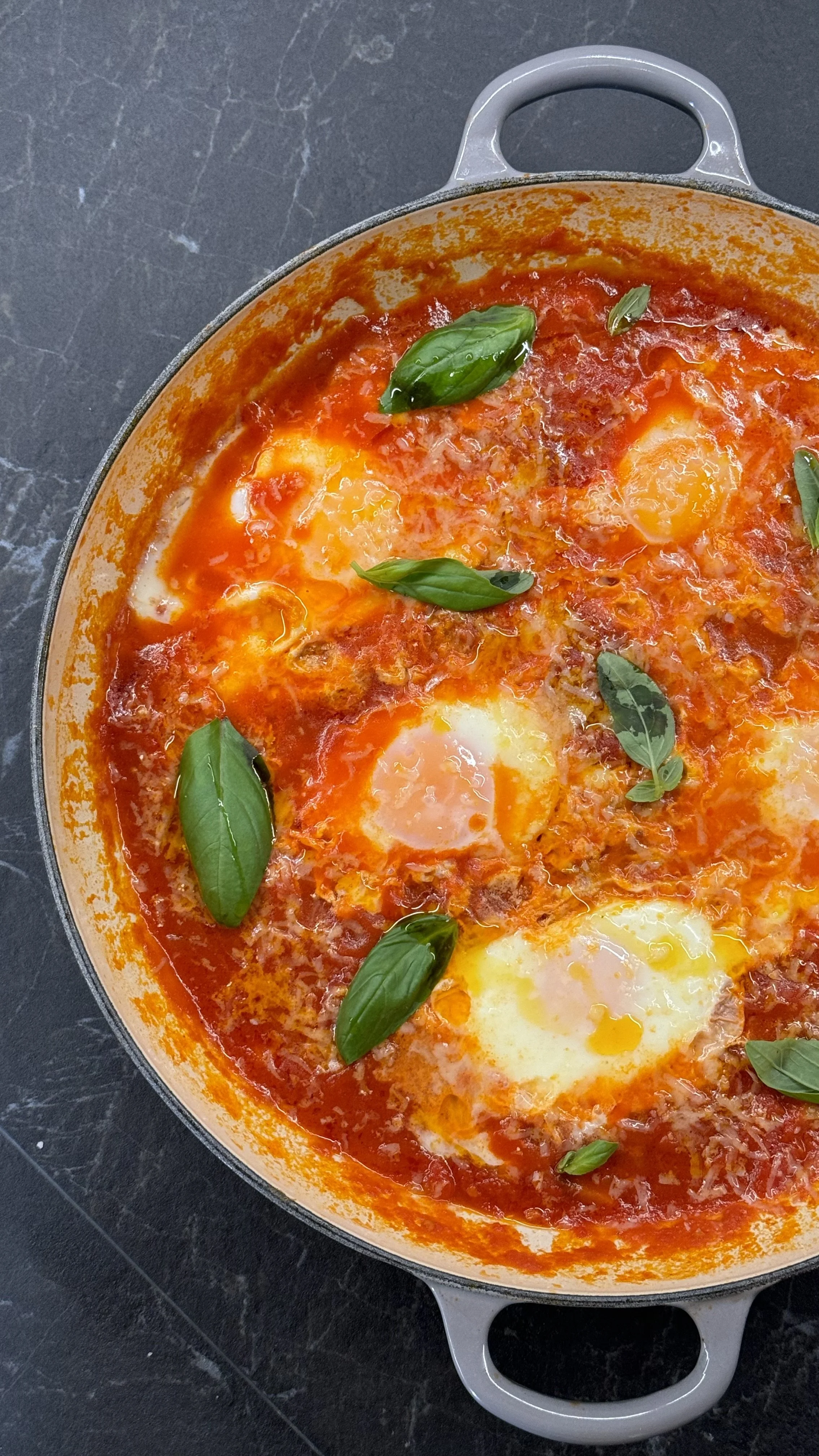 Per questa ricetta vi serve solo una pentola e un cucchiaio di legno. In una pentola ampia fate sudare della pancetta affumicata a cubetti con un giro d’olio evo e un po’ di peperoncino. Unite della cipolla dorata tagliata sottile con i gambi del basilico e fate stufare dolcemente. Solo adesso aggiungete i pelati rompendoli un po’ con il cucchiaio di legno. Lasciateli cuocere 15/20’ fino a quando non si restringono e concentreranno il loro sapore. Solo adesso aggiungete le uova. Fate spazio nel sugo di pomodoro e rompete le uova. Chiudete con il coperchio e fiamma bassa cuocete per 5 minuti, il tuorlo deve rimanere fondente. Salate solo gli albumi così non sporcate i tuorli.